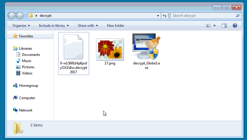 復号鍵を発見するには、同じファイルの暗号化されたファイルと暗号化されていないファイルの両方を同時に decrypt_Globe3.exe アイコン上にドラッグする必要がある。あなたが一つのファイルの暗号化されたバージョンと暗号化されていないバージョンの両方を選択したら、その両方を、この実行ファイル上にドラッグしなさい。この復号プログラムを使用するためのファイルを見出そうとするなら、C:\Users\Public\Pictures\Sample Pictures フォルダ中に見出されるサンプル画像(【訳注】 あなたのピクチャ フォルダに存在しているサンプル画像。このファイルも暗号化されている場合は、同一のファイルを知人や会社からもらってきてください)を使用することができる。ファイルのサイズに着目し、暗号化されていないサンプル画像と、同じサイズの暗号化されているサンプル画像を選択する。